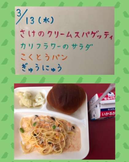 『さけのクリームスパゲティ』は、紅ざけフレークを使用し、春らしい淡いピンク色の仕上げています☆☆☆