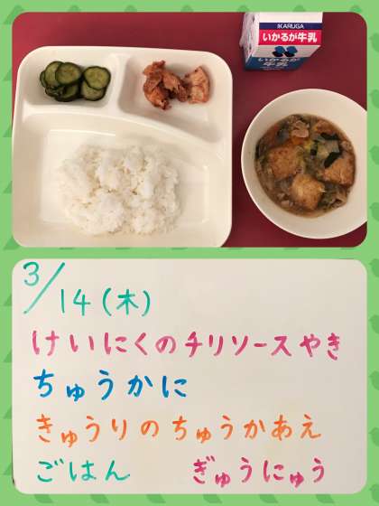 『鶏肉のチリソース焼き』は、鶏肉に、しょうが、にんにく、ケチャップ、トウバンジャン、砂糖、塩、こい口醤油で下味をつけて焼き物機で焼いています☆☆☆