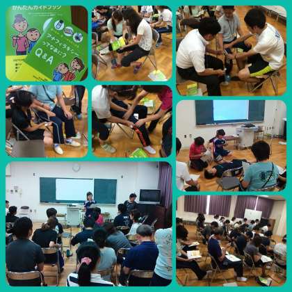そこで、食物アレルギーのある子どもが、急激なアレルギー反応を起こした時に適切な対応ができるよう、教職員で研修を行いました。アレルギー反応に関する基礎知識をビデオで学んだ後、実際に場面を想定した救急対応の訓練をしました。