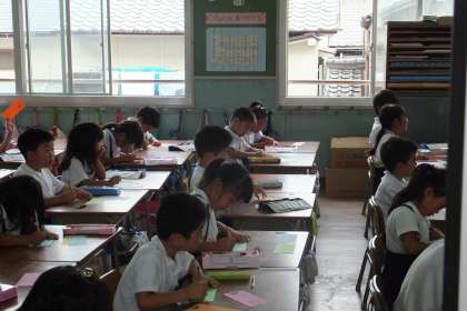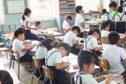 この栞は、毎年、全校児童で南百済地域にお住いのお年寄りに向けて約1500枚を作っています。1年生は、初めての栞づくりで、1学期に習ったひらがなで頑張ってメッセージを書いていました。