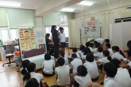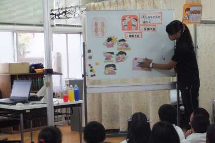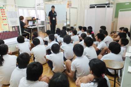 最初に、保健室の先生から熱中症の話を聞きました。熱中症にならないためには、体調管理と水分補給が大切なことを学びました。