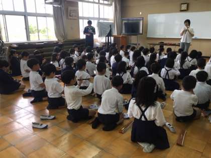 まずは、色々なリコーダーを見せてもらい、子どもたちは興味津々。