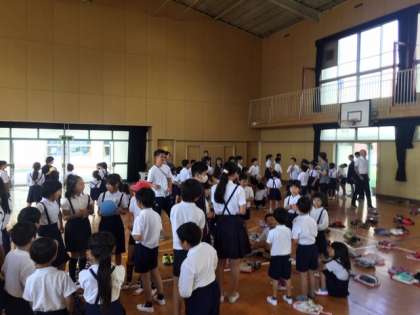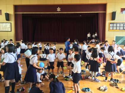 班で立って円を作り、音楽が流れている間ボールをまわします。そして音楽が止まった時にボールを持っている児童が自己紹介をして座るというゲームです。