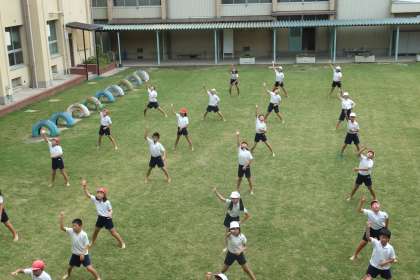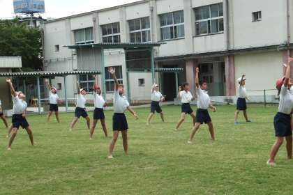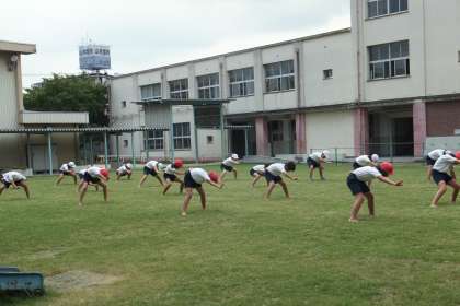 9月11日(木)、5年生のクラスが中運動場で運動会の練習をしていました。
