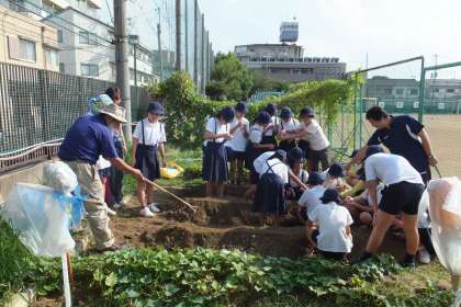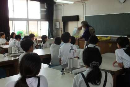 最初に理科室で、田辺大根ふやしたろう会の吉村さんから田辺大根のお話をしていただきました。そして、持ってきていただいた種を東運動場の学習園で一緒に蒔きました。