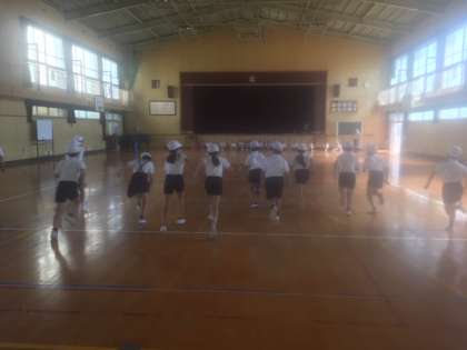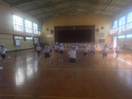 2年生が外で体力テストをしている同じ時に、体育館では4年生が20メートルシャトルランの測定をしていました。