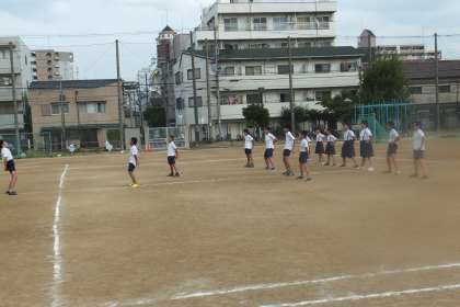 広い運動場で声を出して練習するのは初めてなので、少し緊張していました。団長・副団長中心に振りをつけて練習しているうちに、だんだん大きな声が出てきました!!