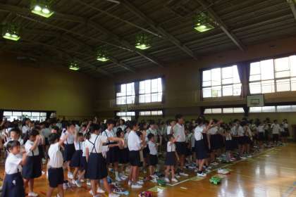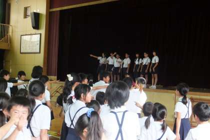 集会委員が前に立ち、「猛獣狩りへ行こうよ!!」のゲームをしました。