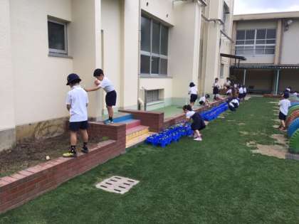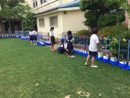 子どもたちは登校後、ペットボトルを持って水やりをしています。