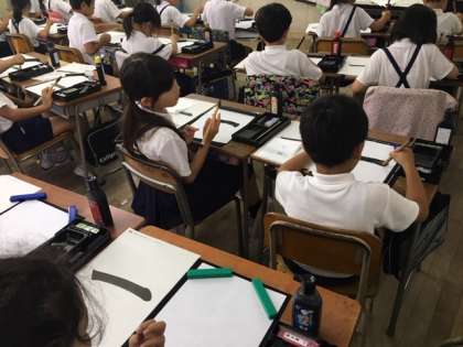 次は筆に墨をふくませて、筆の動かし方を練習しました。線をかいたり、円をかいたりと、半紙に何度も練習しました。