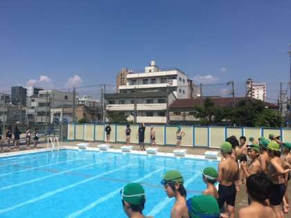 5年生ではそれぞれのクラスの代表が、今年の水泳学習での目標をみんなの前で発表しました。