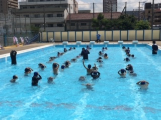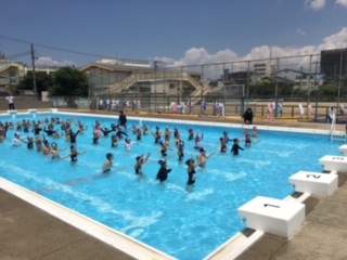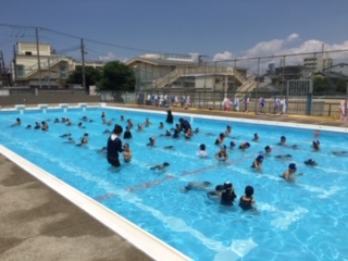 並び方やペアを確認した後に、前回6年生に教えてもらった入り方(足から頭へと順に体に水をかける。後ろ向きで入る。)でプールに入りました。