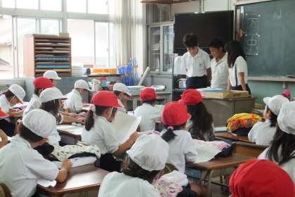 団員は、少し恥ずかしいそうにエールの内容を書いたプリント配り、練習を始めました。それでも、担任の先生にも助けられながら、だんだん盛り上がり、最後には拳を突き上げ、「フレッー、フレッー赤組!!白組!!」と大きな声を出していました!!