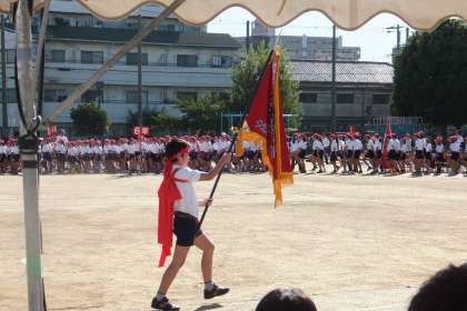 開会式の様子です。昨年度の優勝チーム、赤組の団長が優勝旗を持って入場です。