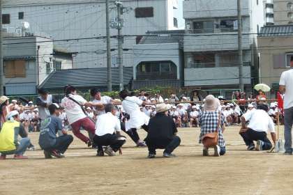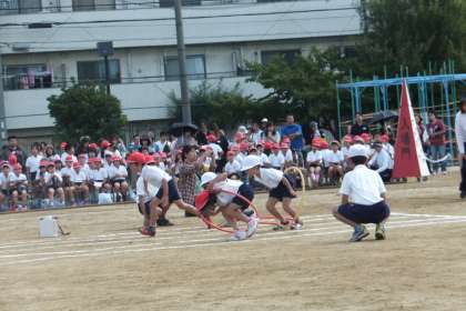 赤白対抗リレー・2年生の走って跳んで忍者修行・PTA綱引きの様子です。