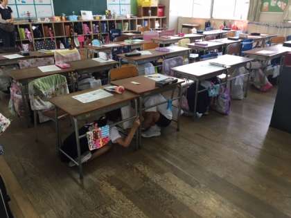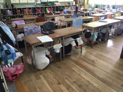 その後、防災無線からの放送に合わせて地震から身を守るための訓練を行いました。