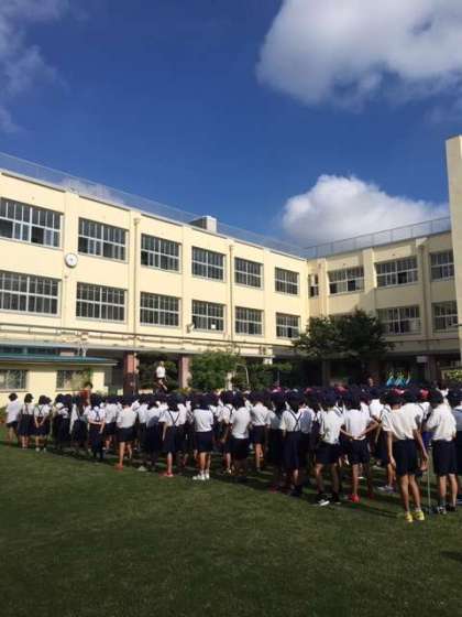 9月も半ばに近づいているのに、真夏のような陽射しの下、今朝は児童朝会がありました。