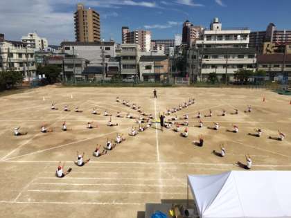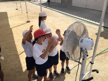 また、連日の暑さの中がんばる子どもたちのために、地域の協力のもとミストが出る扇風機を設置しました。また霧吹きなども使用し、暑さをすこしでも軽減させようと努めています。