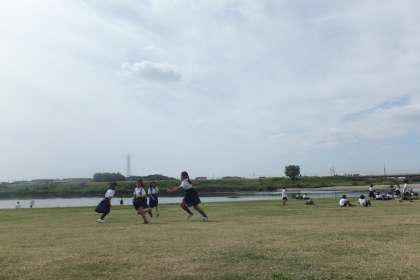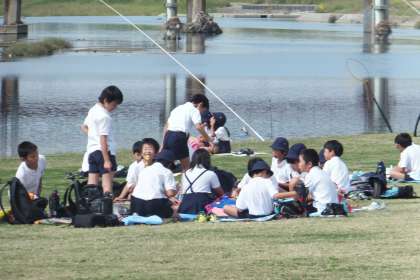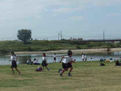 歴史資料館を見学したあと、大和川の堤防を歩きました。暑いほどの陽射しでしたが、爽やかな風が吹いていました。河川敷の芝生に下り、お弁当を食べました。みんなグループに分かれてとても楽しそうでした。そして、次は自由時間。たっぷり、鬼ごっこを楽しみました。