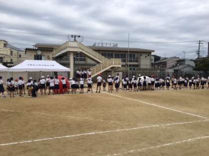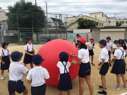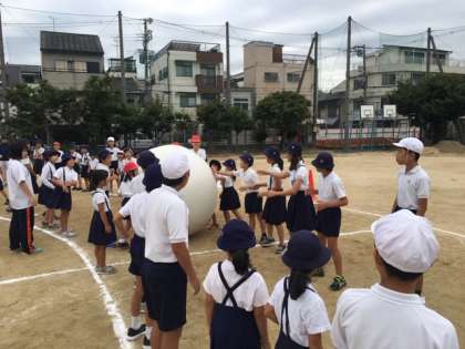 A班とB班の二手に分かれて列を作り、運動場半周分どちらが早く大玉を送ることができるのかを競いました。