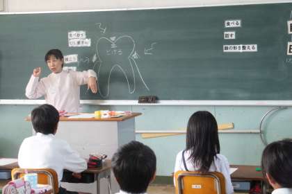最初に歯科衛生士の先生から「歯」に関するお話を教室で聞きました。