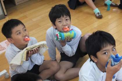 そのあと、保健室でフッ化物塗布をしました。「アッ、にが〜い!!でも、ツルツルになった!!」と、口を開けたまま話す児童もいました。