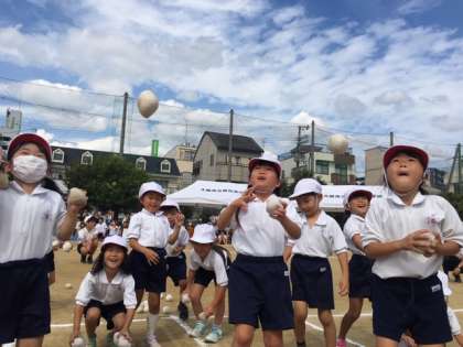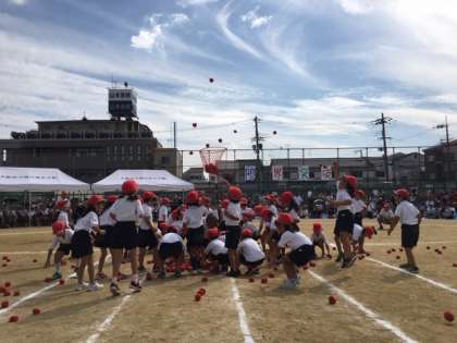 開始の合図と同時に一目散に玉に向かって走っていき、カゴに向かって次々と投げていきました。