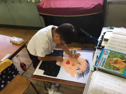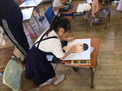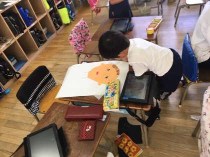 タブレット端末で自分の写真を撮り、それを見ながら自画像を描きました。