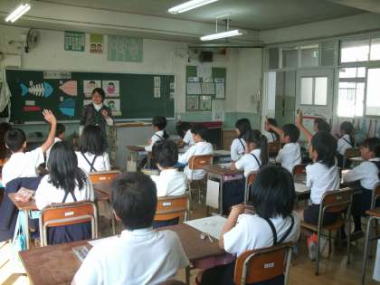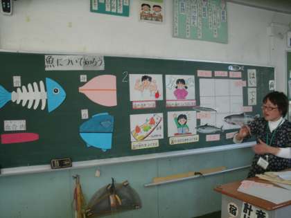 テーマは、「魚について知ろう!!」で、栄養教諭の先生が、「魚の体のいろんな部分にどんな栄養があるか」、「魚を食べるとどんないいことがあるか」を教えてくださいました。