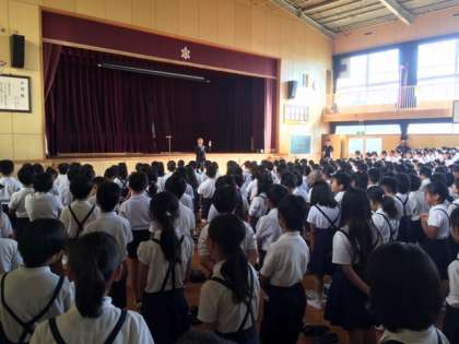 週末の芝生作業から1ヶ月間は芝生の養生期間に入ったため、今朝の児童朝会は講堂で行いました。
