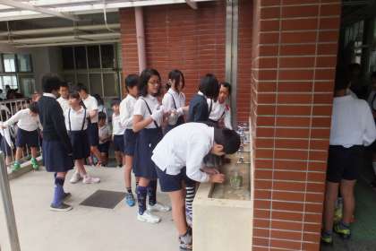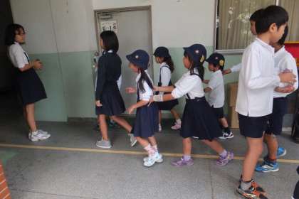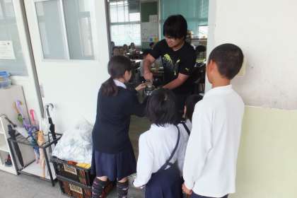 この日は、1年生と6年生でヒヤシンスなど水栽培の球根をセットし、各教室に配りました。「授業中、失礼します」「大切に育ててください」と1年生もきっちりとした言葉づかいかできていました。