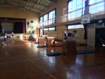 また、台上前転で台から落ちる感覚がこわいということで、大きな高跳び用マットと舞台を使って、こわさを克服する練習をしていました。
