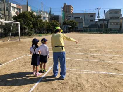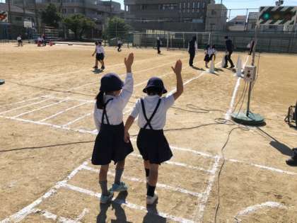 東運動場に作った特設コースで、低学年は歩行の練習をしました。