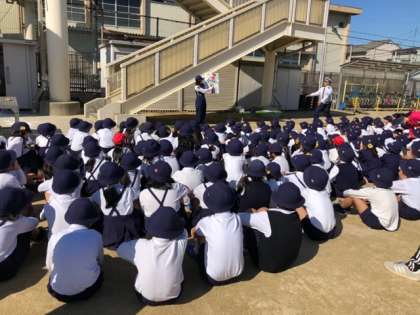 今日は東住吉警察から2名の警察官を、東住吉区役所から2名のラビット隊の方を迎えて交通安全教室が開かれました。