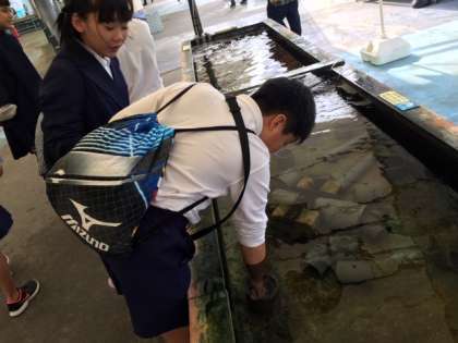 タッチプールでは、タコやヒトデに恐る恐る手を伸ばしています。