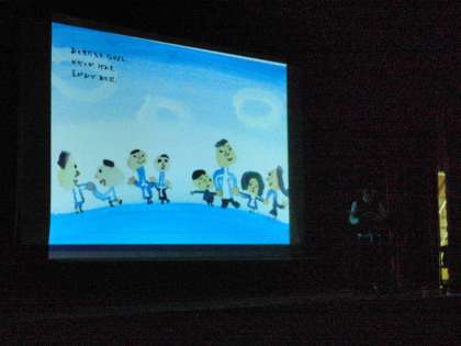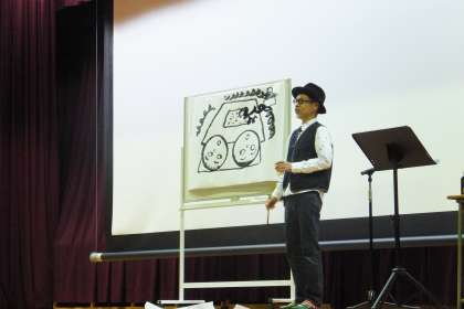 お話しは、先生が描かれた絵本を題材に楽しいお話を、ウクレレを演奏しながら歌で、絵を描きながらライブ絵本でしていただきました。