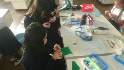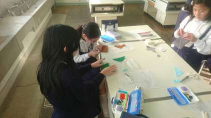 フェルトの生地を型紙どおりに切り、それを縫い合わせたり、ボタンをつけたりしてネズミ顔のポシェットを作っています。