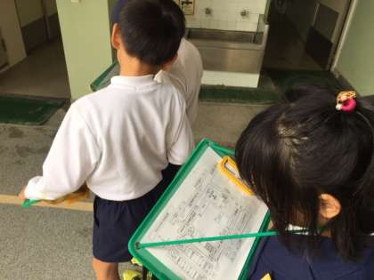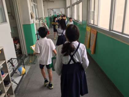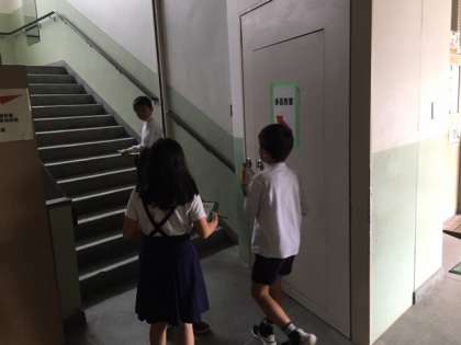 今日は学校内の火事を防ぐ工夫として、消化器や防火バケツ、防火扉などの設備がどこにあるのかをグループで校舎をまわって確かめていきました。