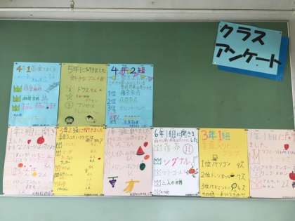 「好きな音楽は何ですか?」「好きなマンガは何ですか?」「楽しみな学校行事は何ですか?」「好きなフルーツは何ですか?」など学年ごとにテーマは違いますが、今の南百済の子どもたちの様子がよく分かりますね。