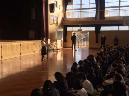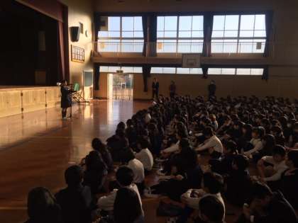 校歌を歌う子どもの口から白い息が見えるほど冷え込んでいた体育館でしたが、みんなしっかり校長先生や生活指導の先生の話を聞いていました。