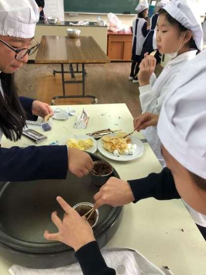 できあがったチョコレートフォンデュにバナナなどのフルーツやビスケットなどをつけて食べました。