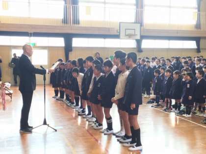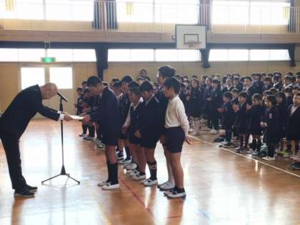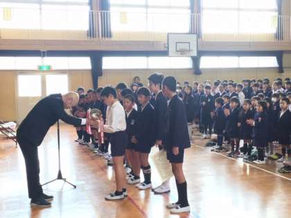 今朝の朝会では賞状と優勝カップの授与が行われました。