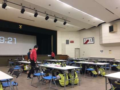 説明ビデオの途中に緊急地震速報が流れて、防災サバイバルスタート!