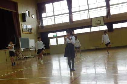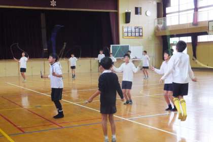 今年の「なわとび週間」では、音楽に合わせてリズム跳びに挑戦しますが、運動委員はみんなの前で手本として跳ばなければなりません。約4分間、跳び続けるのは、けっこうハードで、休憩をとりながら頑張っていました。