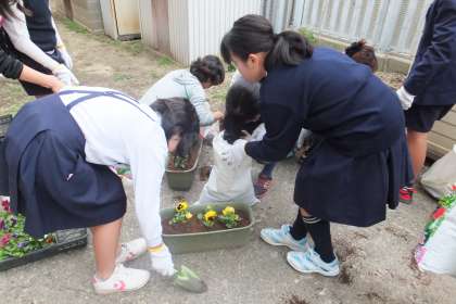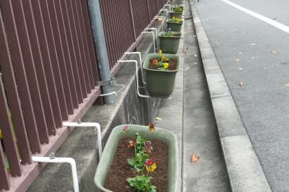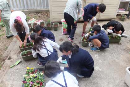 この日は、プランターの花の植替えをしました。寒さに強いパンジーとビオラをプランターに移植し、正門前や玄関に運びました。