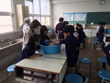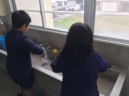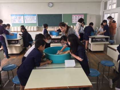 各自、掃除で使った雑巾を地域の方の指導のもと、洗濯板と洗濯石けんを使って手洗いしていきました。