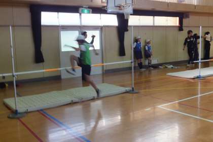学習の単元は「走り高跳び」、子どもたちは、「助走の最後の3歩をリズムアップし、強く踏切、高く跳ぶこと」を身に着けるため、グループで互いの課題を見出し、解決できるように取組んでいました。
