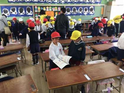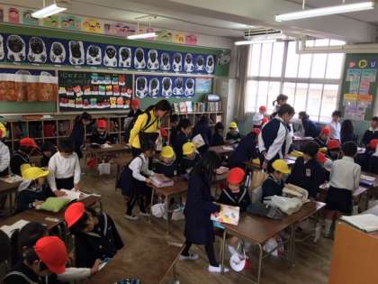 まずは教室に招待して1年生の机や学習道具、ランドセルなどを見せてあげました。