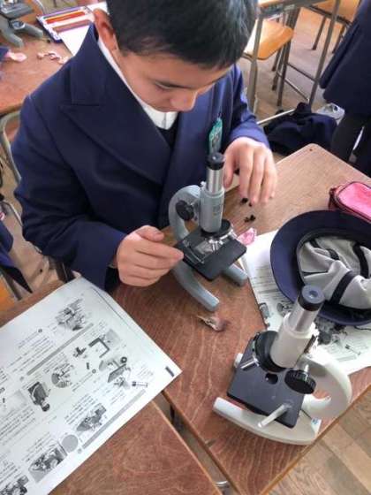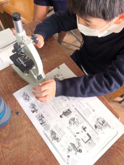 今日は自然の中にあるものを顕微鏡を使ってた観察しました。1人1つの顕微鏡を使い、花粉や植物の茎を見た後、チョークの粉や赤鉛筆の芯の粉、ホコリなども見てみました。チョークの粉を見た時には、こんなに綺麗な塊をしていたんだ、ホコリを見た時には糸がこんなに絡んでいるのだと言った言葉が出ていました。5年生で習う顕微鏡の学習ですが、クラブでは4年生から扱います。4年生のみんなは興味を持って活動に取り組んでいました。また、使い方を上級生が教えている姿にもほっこりしました。