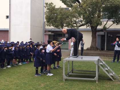 今朝は校長先生のお話のほかに南百済ホーネッツ(ミニバス)の女子が喜連西卒業記念カップで3位の成績をおさめたので、その表彰が行われました。